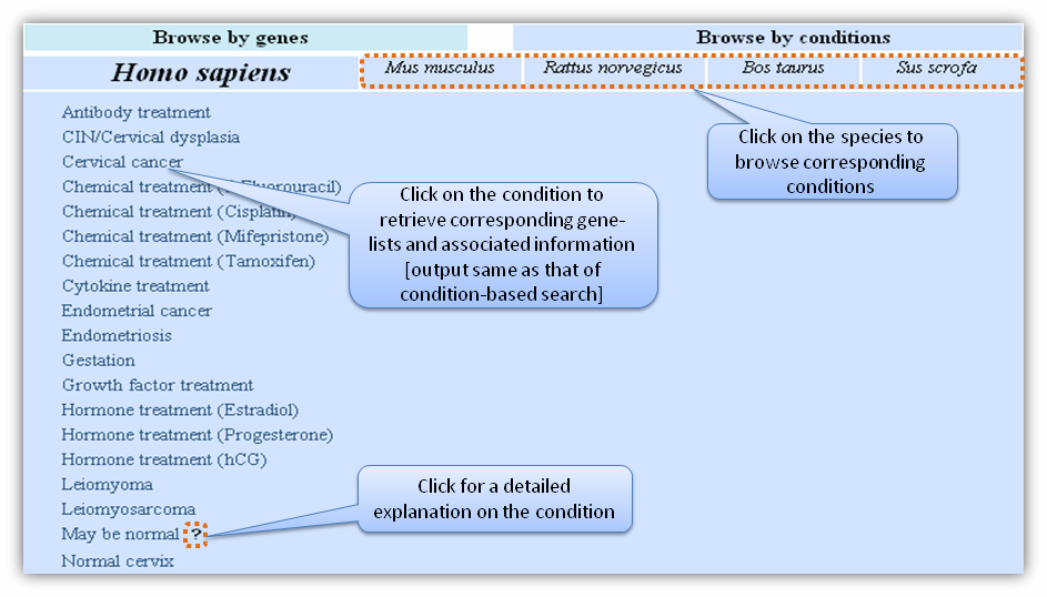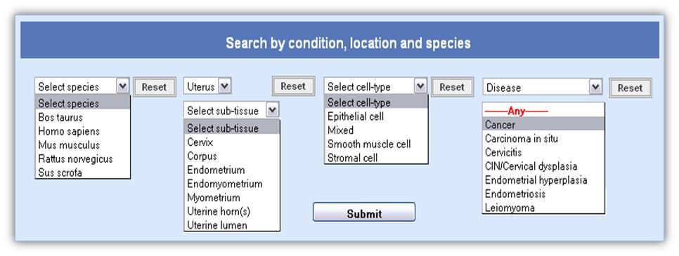 Condition based searchCondition-based search can be performed by selecting species, location (tissue/cell-type) and condition from each of the drop down menu provided in the search page (Figure A).For each species, a specific population/strain type can be chosen. Similarly, the search can be restricted to a specific sub-tissue of interest (e.g., cervix, endometrium, myometrium). A sub-condition for each physiological or pathological condition can also be chosen. For example, while querying for .cervical cancer. the user can choose a subtype of cancer ("squamous cell carcinoma" or "adenocarcinoma").