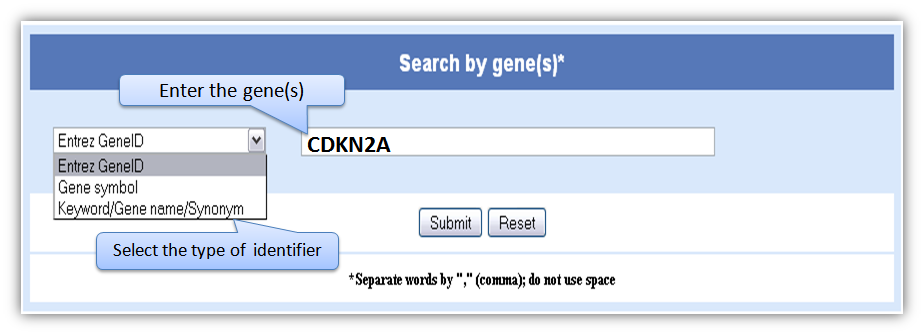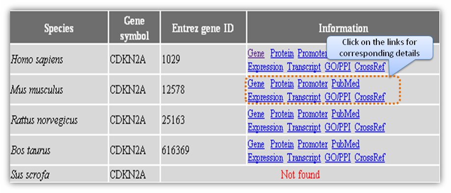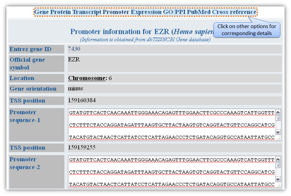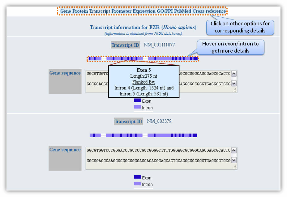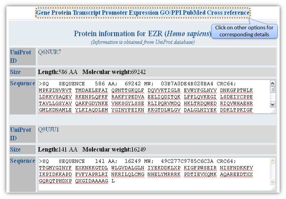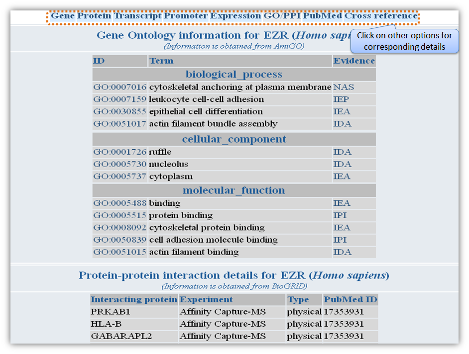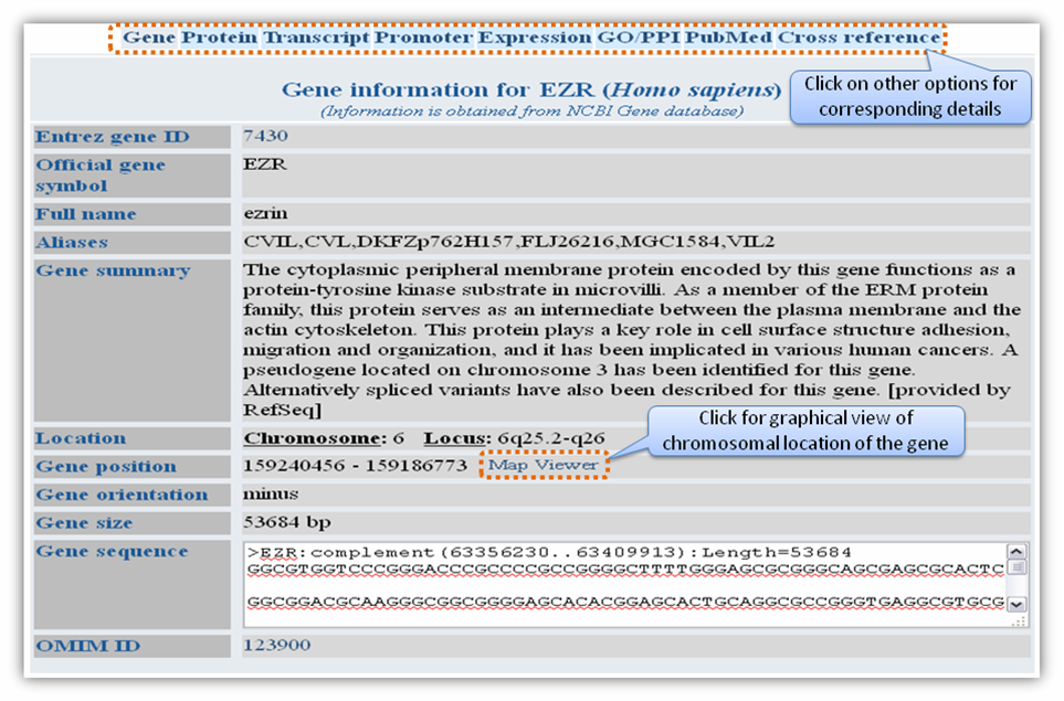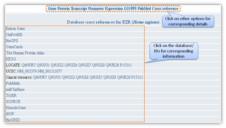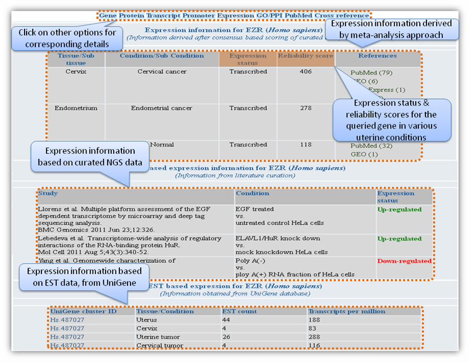 Figure H. Expression information Gene based searchGene-based search can be done by entering either Entrez gene ID or gene name/symbol or gene keyword. Multiple gene identifiers can also be queried by separating them with a comma (Figure L).