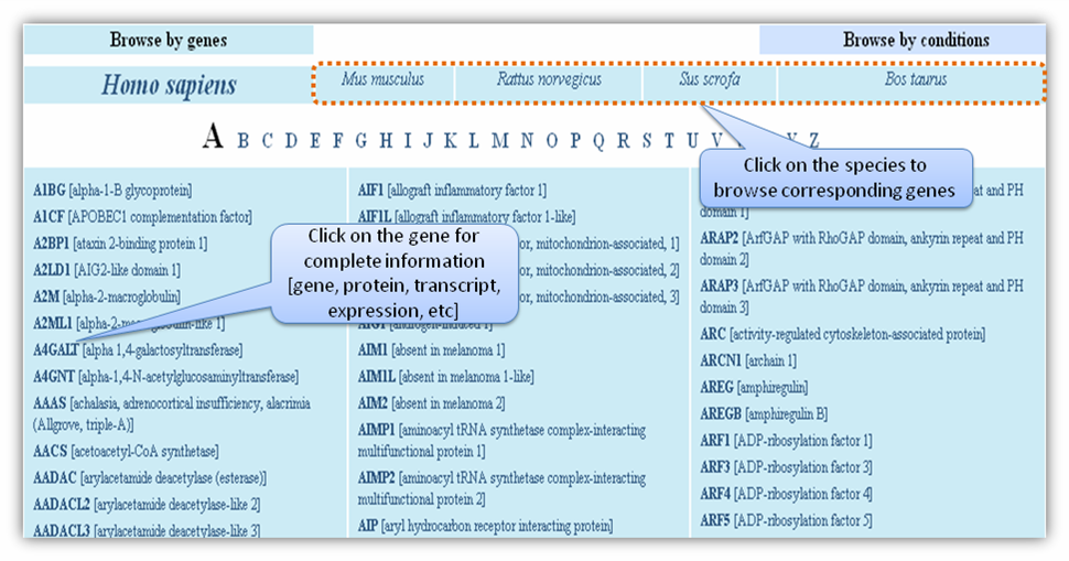 Clicking on each link under the information column will take to the corresponding details (Figure D - K). Browsing the databaseBrowse by geneBrowse by gene allows to browse the genes and related information by clicking on the gene listed in alphabetical order. Clicking on any gene in the list will take to the complete information page (Figure D-K) of the corresponding gene Browse by conditionBrowse by condition allows to browse the important conditions listed under each species. Clicking on any condition in the list will take to the result page with gene-lists (transcribed & dormant) (Figure B) of the corresponding condition. |