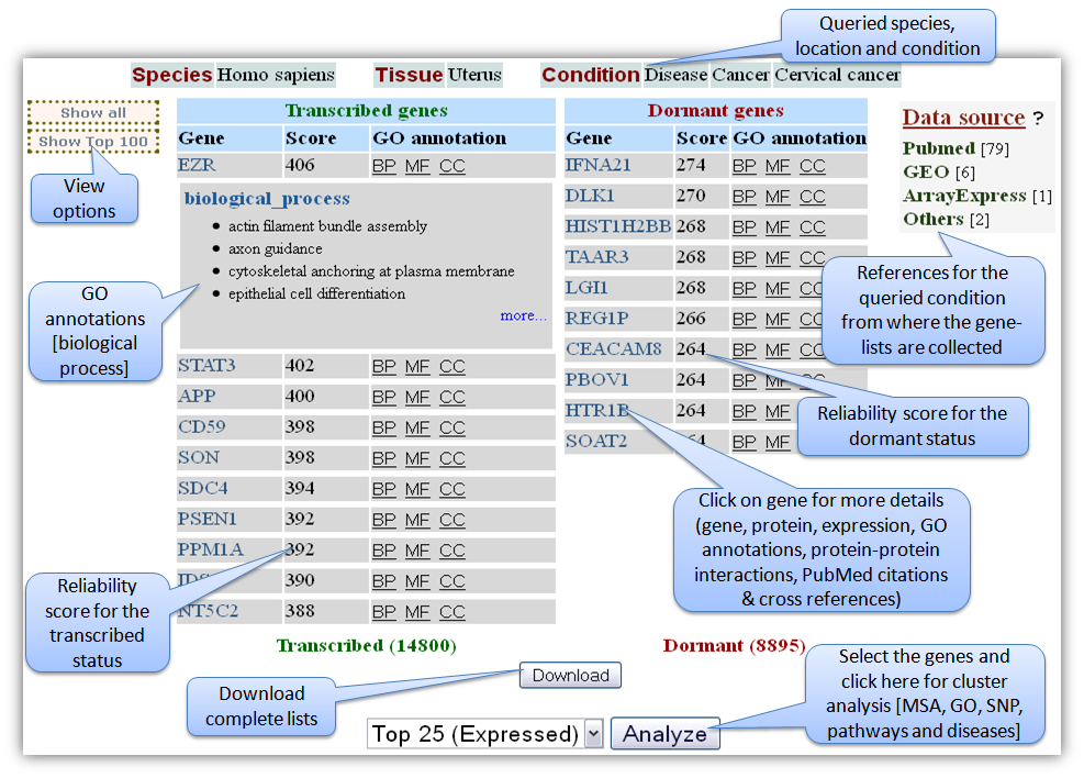 Figure A. Query page for condition-based search Querying by a condition results in two gene-lists (Figure B),"Transcribed list" and "Dormant list". "Transcribed list" of genes represent the genes that are expressed, and "Dormant list" of genes represent the genes that are not-expressed, in the queried condition. The queried species, location and condition are displayed at the top of the result page. The complete list (transcribed and dormant) can be downloaded in text format by clicking the "Download" option. Gene-lists are also provided with the corresponding reliability scores for the genes. expression status, and Gene Ontology annotations for the first 100 genes. "Data source" section provides the references from where the genes were curated. Cluster (first 25/50 genes) analysis can be performed by using the "Analyze" option provided at the bottom of the result page (Figure B). The cluster analysis page is provided with various options (Figure C). "Cluster analysis using GeneMANIA" option allows the user to visualize the functional gene networks such as co-expression, protein-interaction and pathways. Multiple sequence alignment (gene/protein/promoter) can be performed for the genes of interest using "Align" option. Other analysis includes SNPs, pathways, diseases and GO annotations.