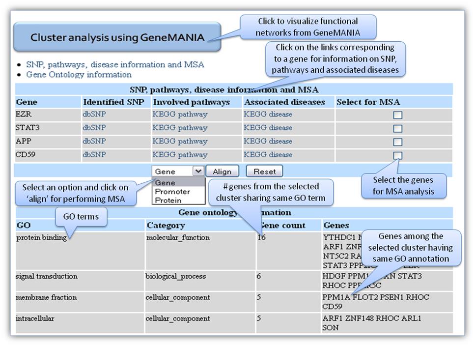 Figure C. Result page for cluster analysis Clicking on any gene in the result page (Figure B) takes to the gene information page that has basic information on the gene (Figure D), and links to other information such as protein, transcript, promoter, expression, GO/PPI, PubMed and cross reference (Figure E - K).